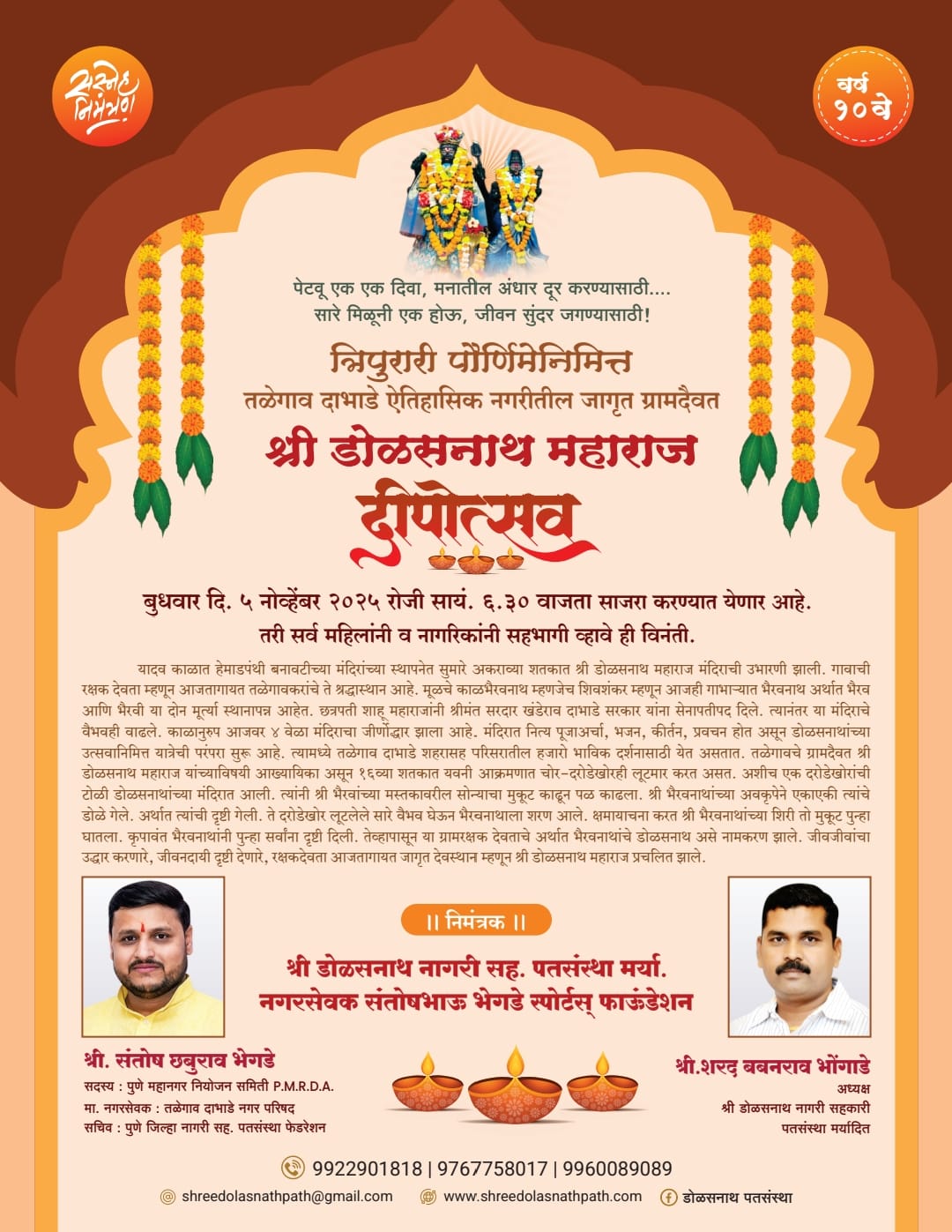 त्रिपुरारी पौर्णिमा निमित्त तळेगाव दाभाडे ऐतिहासिक नगरीतील जागृत ग्रामदैवत श्री डोळसनाथ महाराज दीपोत्सव बुधवार (दि ५) सायंकाळी ०६.३० वाजता ५ हजार दिवे प्रज्वलित करून साजरा करण्यात येणार आहे.